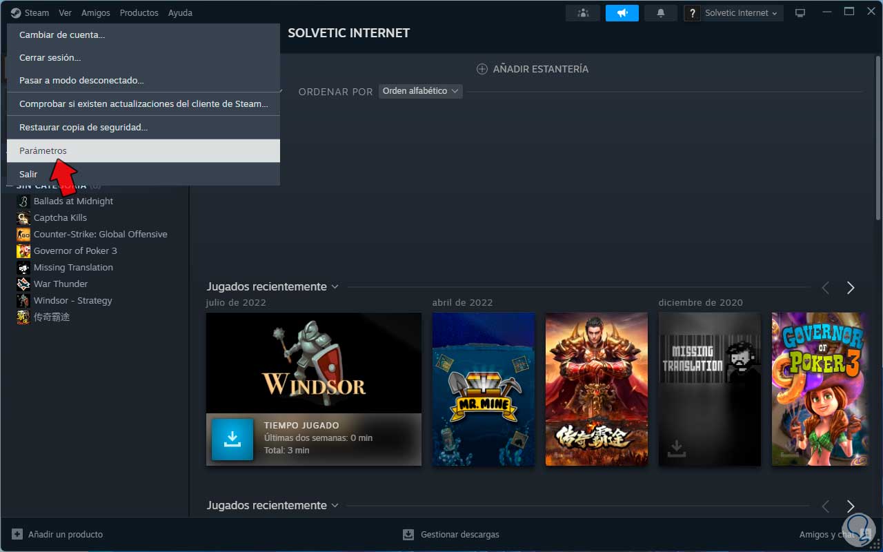 Para lograrlo abrimos Steam y desde el menú “Steam” de nuevo damos clic en “Parámetros”: