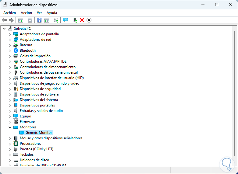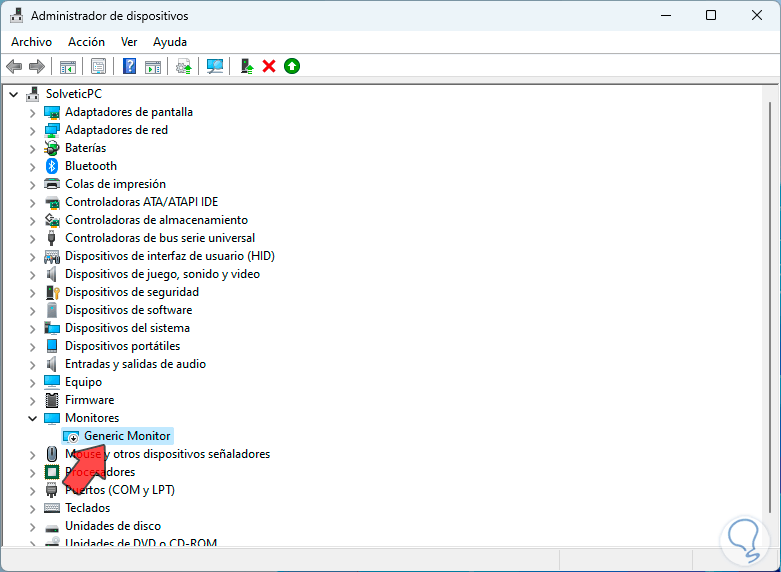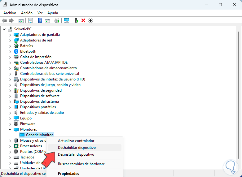 Ahora vamos a ir a la sección “Monitores” y allí daremos clic derecho sobre el controlador y seleccionamos la opción “Deshabilitar dispositivo”: