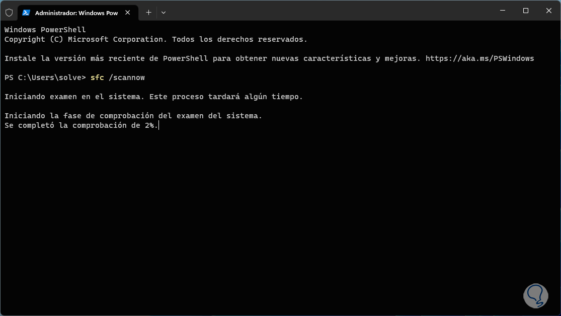 Ahora vamos a ejecutar el comando “sfc scannow” para realizar el escaneo del sistema: