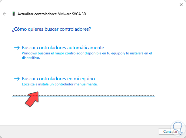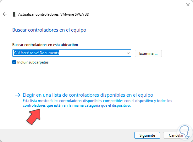 Allí damos clic en “Buscar controladores en mi equipo” y luego damos clic en “Elegir en una lista de controladores disponibles en el equipo”: