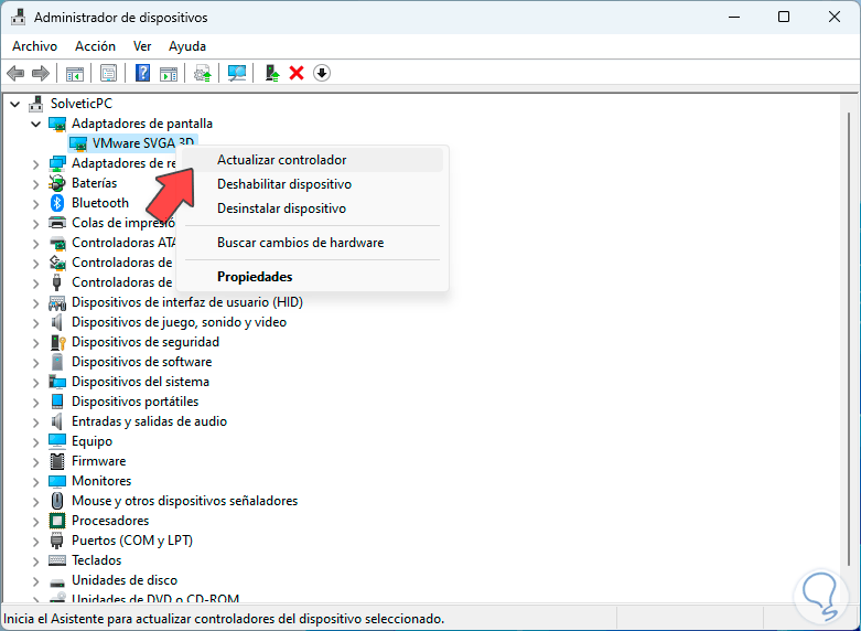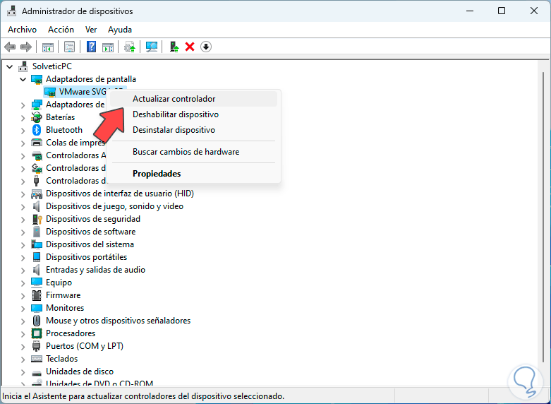 Ahora vamos a ir a la sección “Adaptadores de pantalla”, allí damos clic derecho sobre el controlador y seleccionamos la opción “Actualizar controlador”: