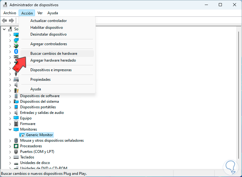 Ahora vamos a ir al menú “Acción” y daremos clic en la opción “Buscar cambios de hardware”:
