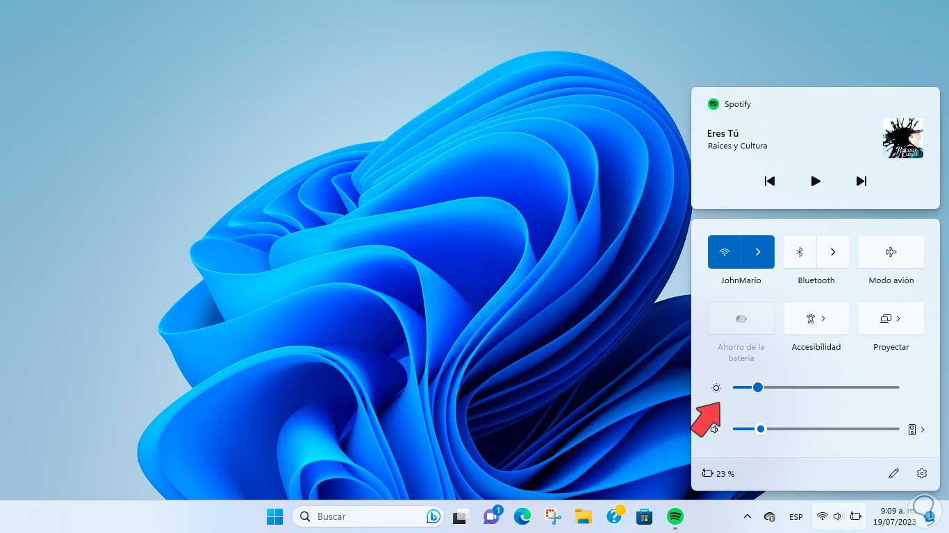 Esta es la forma tradicional como administramos el brillo de la pantalla en Windows 11, para este paso disponemos de dos opciones, en primer lugar podemos dar clic sobre el icono de volumen en la barra de tareas, esto abrirá la configuración rápida, allí deslizamos la barra para aumentar o disminuir el brillo de la pantalla: