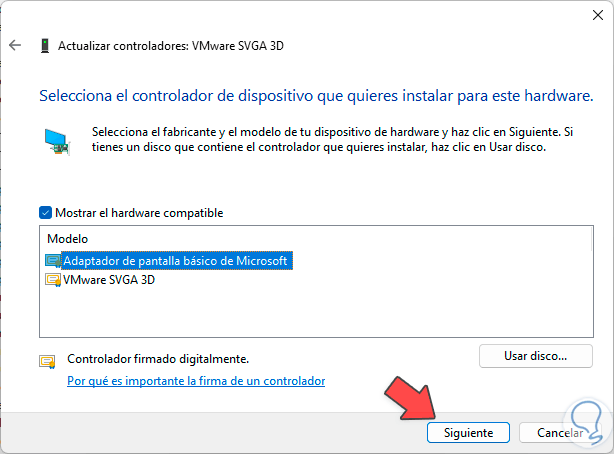 Ahora vamos a dar clic en la opción “Adaptador de pantalla básico de Microsoft”: