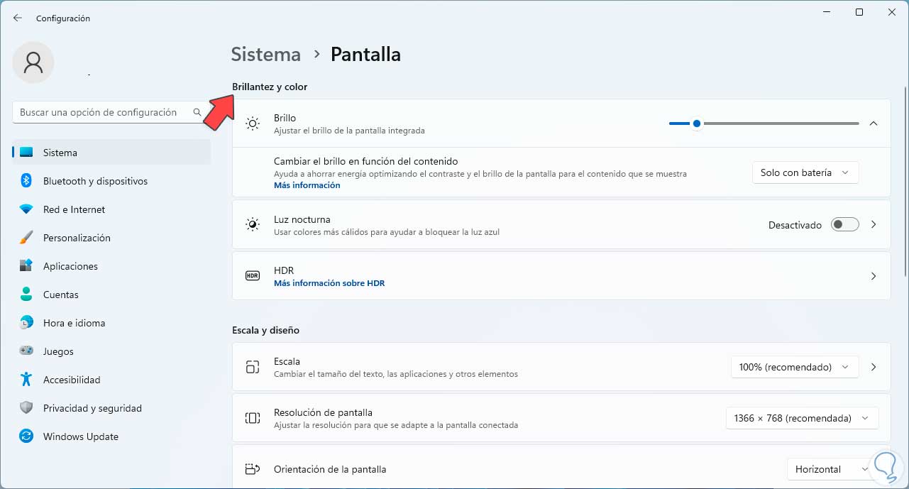 En Windows 11 la sección de Configuración nos permite ejercer algunas opciones sobre el brillo de la pantalla.