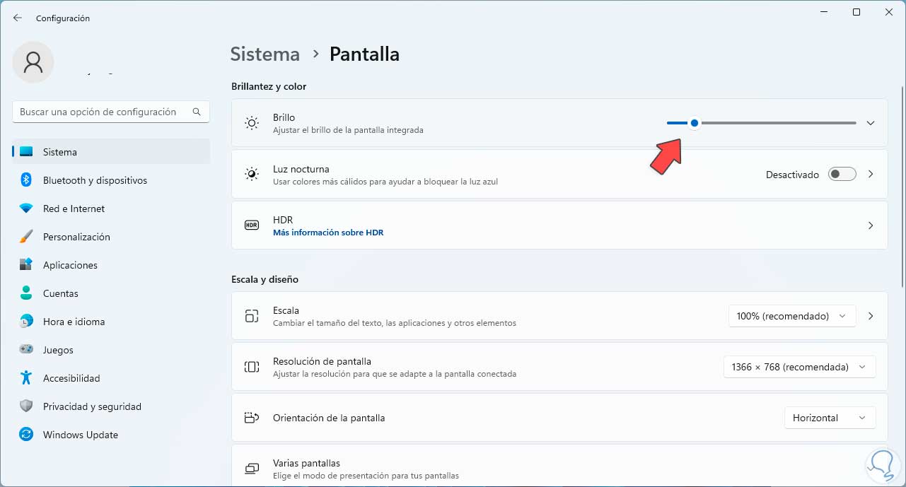 Al acceder allí es posible usar la barra deslizante para establecer el brillo de la pantalla: