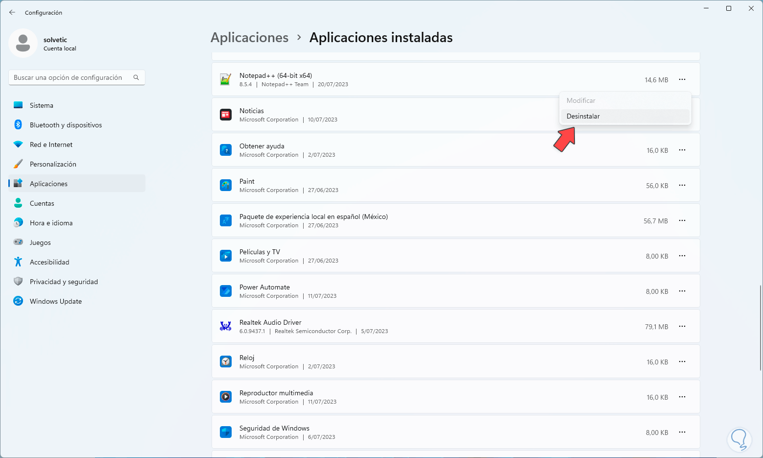 Allí vamos a dar clic sobre el menú contextual de la aplicación a eliminar y damos clic en “Desinstalar”: