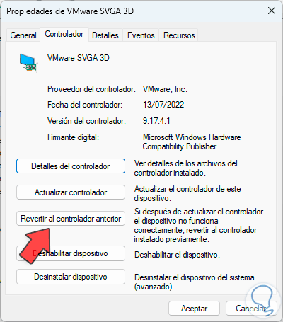 En la ventana emergente vamos a ir a la pestaña “Controlador” y si allí esta activa daremos clic en “Revertir al controlador anterior”: