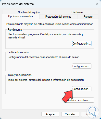 Allí vamos a dar clic en “Configuración” en la sección “Inicio y recuperación” y se abrirá esta nueva ventana: