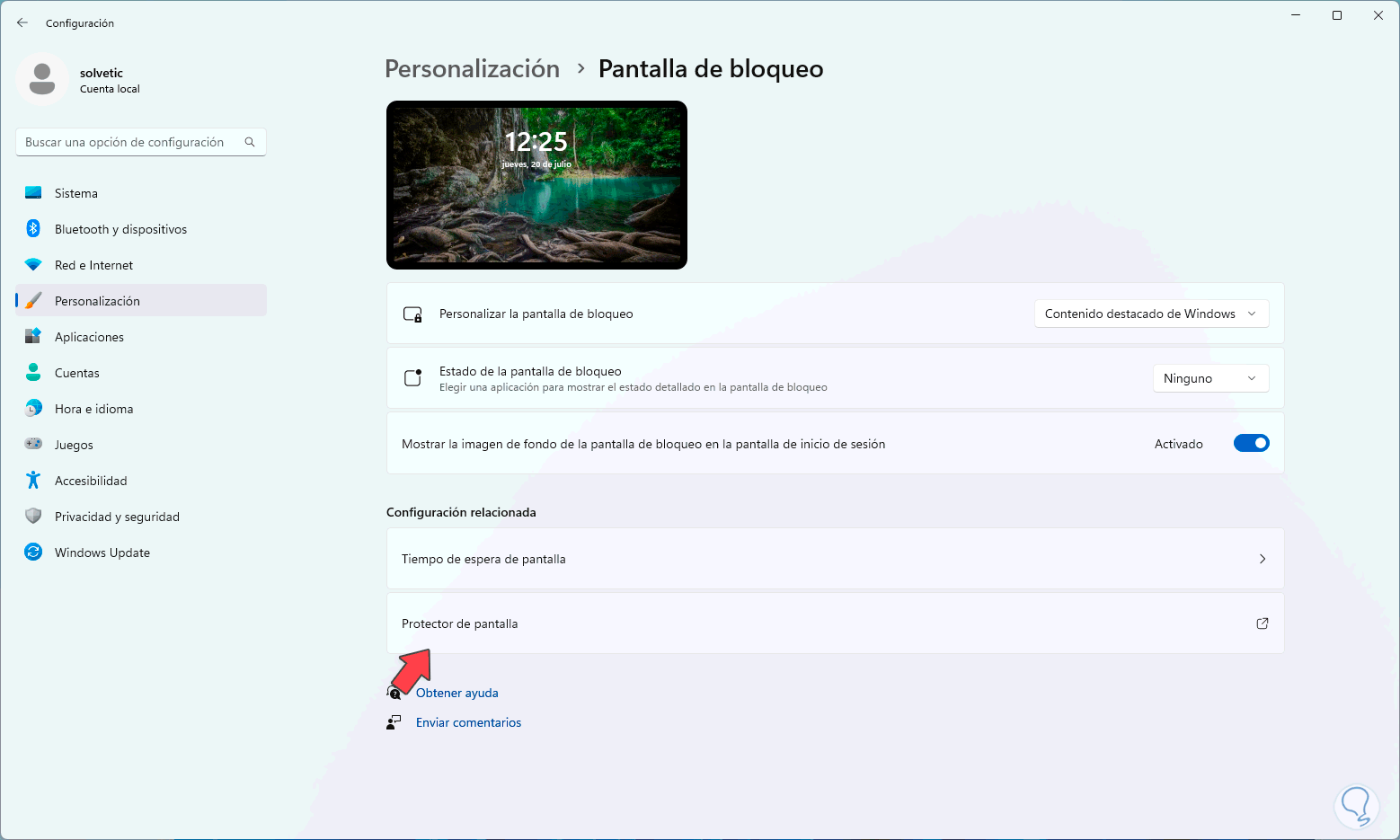 Una vez se inicie la sesión accedemos de nuevo a la configuración de la pantalla de bloqueo y esta vez damos clic en “Protector de pantalla”: