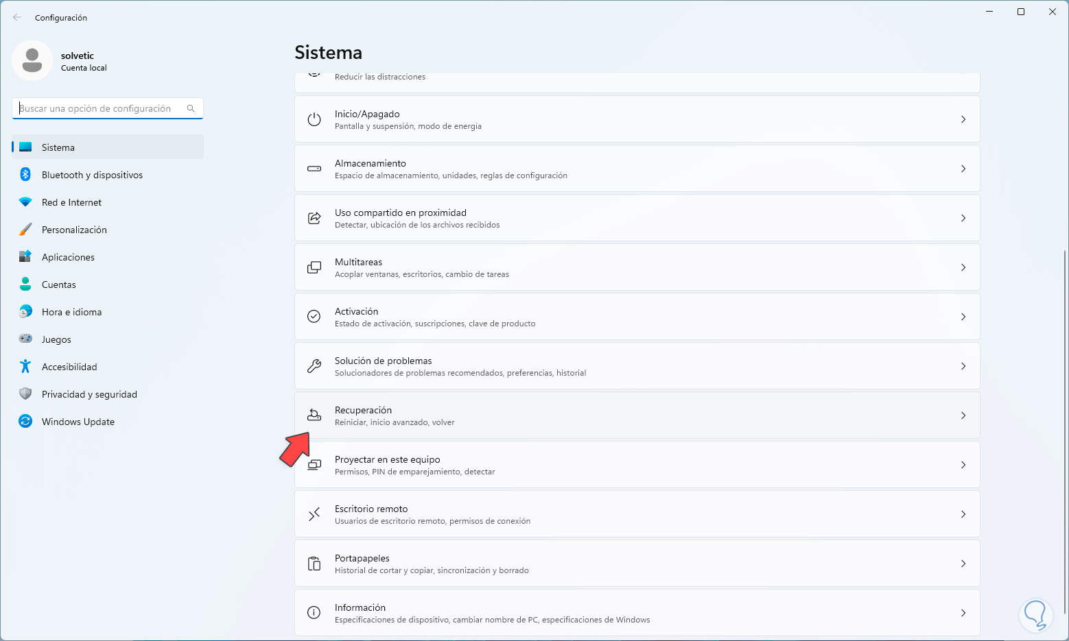 En caso de tener acceso al sistema podemos ir a “Inicio – Configuración – Sistema – Recuperación”: