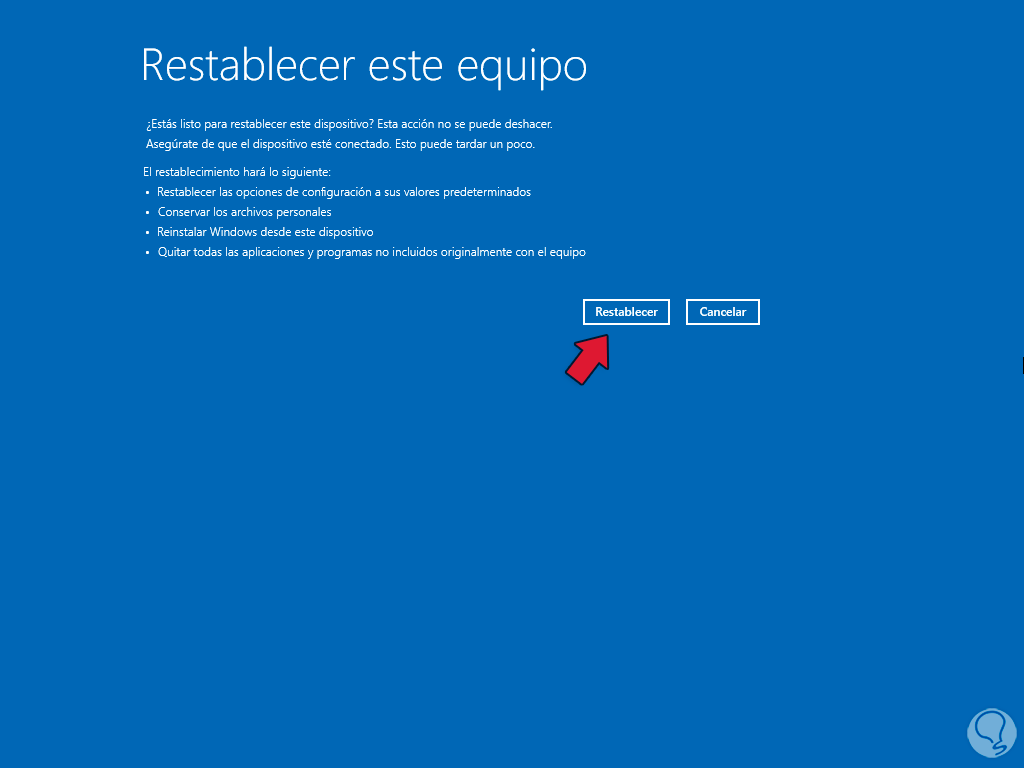 Luego damos clic en “Restablecer” para iniciar el proceso: