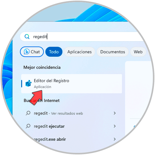 Primero en el buscador de inicio ingresamos la palabra “regedit” y luego damos clic en el editor de registros: