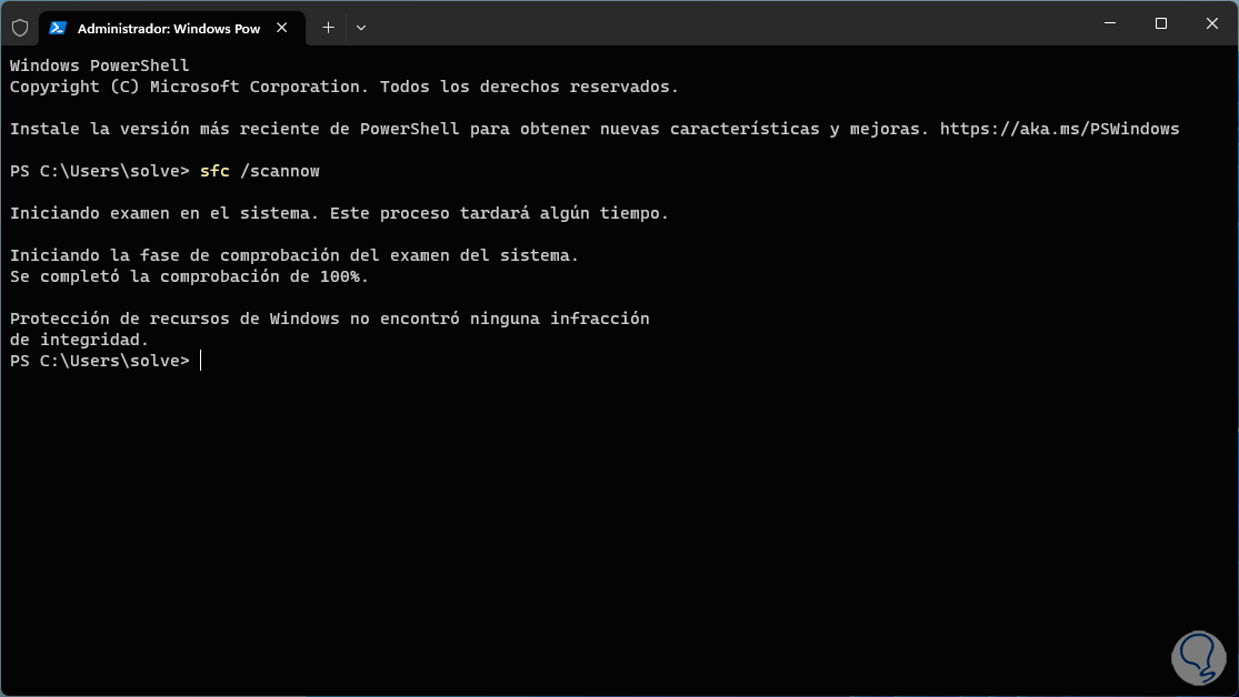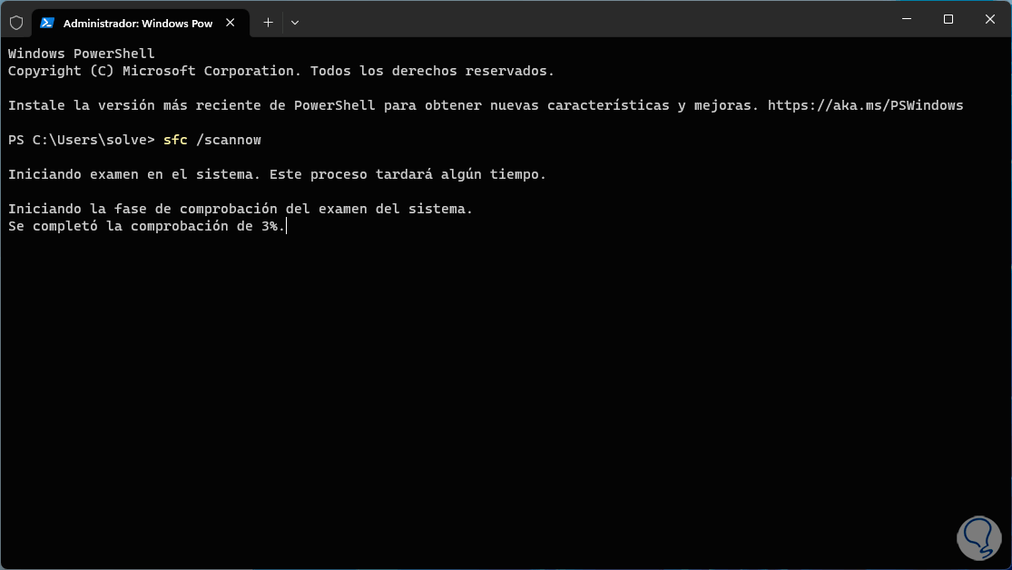 El comando SFC (System File Checker) se encarga de analizar y reparar el sistema de archivos NTFS en caso de que se detecten errores. Esperamos que finalice el proceso: