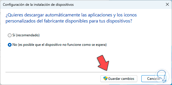 Esta opción permite que las actualizaciones disponibles de los controladores las realicemos de manera personal pero no de forma automática y la razón es que algunas de estas actualizaciones pueden afectar negativamente el Administrador de dispositivos, después de esto aplicamos los cambios.