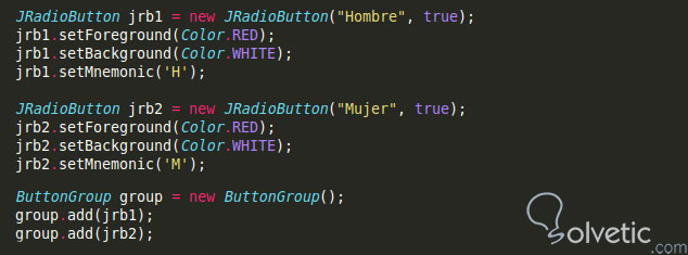 En la imagen vemos como definimos dos botones con diferentes objetos, ambos son instancias de la clase JRadioButton luego creamos un objeto del tipo ButtonGroup con el cual vamos a proceder a añadir los botones que habíamos creado, esto hace que al estar agrupados cuando seleccionemos una opción inmediatamente la otra sea deseleccionada.