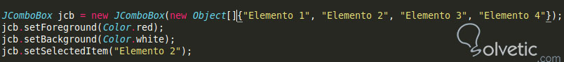 Si nos fijamos creamos una instancia de la clase JComboBox y le pasamos un arreglo de elementos que son los que va a mostrar, luego le establecemos los colores del controlador y finalmente invocamos uno de los métodos que vimos que es el setSelectedItem() en el cual estableceremos el elemento que va a ser seleccionado por defecto cuando se dibuje el control en nuestra interfaz.