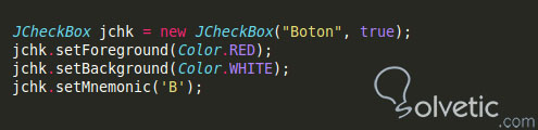 Notamos que el constructor recibe como parámetros el nombre en forma de String y un valor Bool en true, esto último significa que el botón aparecerá marcado o checked por defecto, por último el método setMnemonic, nos permite asignarle un atajo de teclado para poder marcar o no el botón.