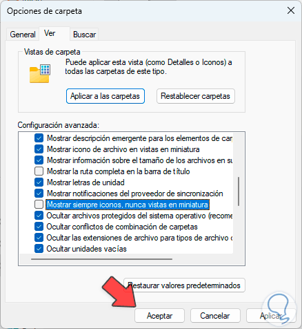 En la ventana emergente iremos a la pestaña “Ver” y allí vamos a ubicar la línea “Mostrar siempre iconos, nunca vistas en miniatura”: