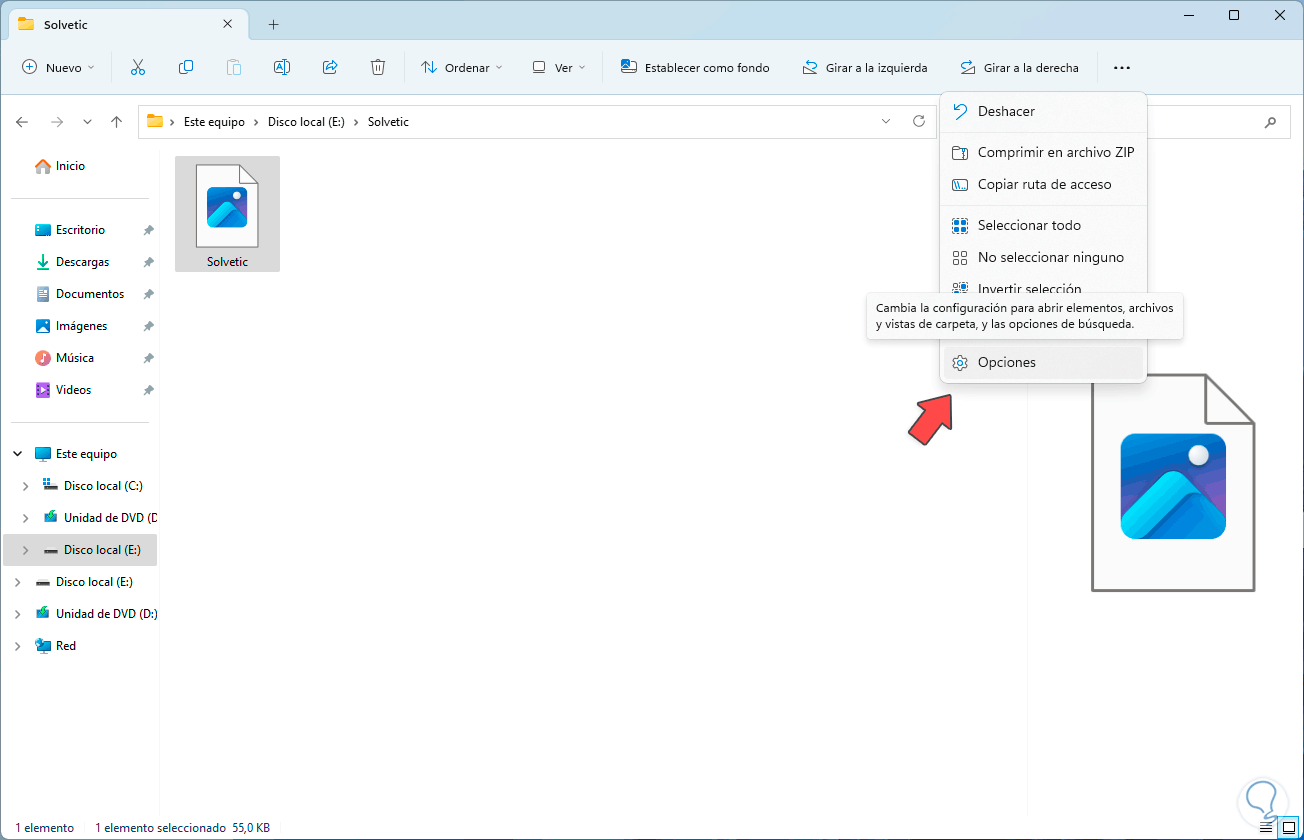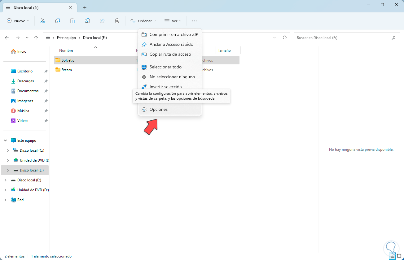 Ahora, allí mismo en el Explorador de archivos de Windows 11, damos clic en “Más información” y luego damos clic en “Opciones”: