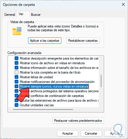 Como vemos si esta activa será la causa de no ver la imagen sino solo un icono, vamos a desactivar la casilla “Mostrar siempre iconos, nunca vistas en miniatura”: