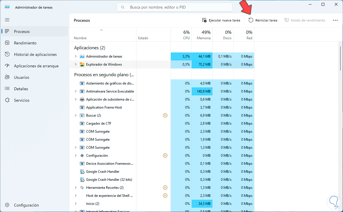 Damos clic en la opción “Reiniciar tarea” y esperamos que el entorno sea cargado de nuevo: