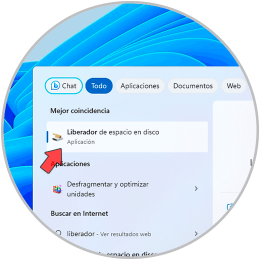 Ahora en el buscador ingresamos la palabra “liberador” y luego damos clic en la opción “Liberar espacio en disco”: