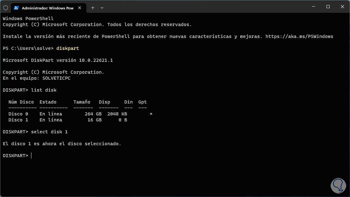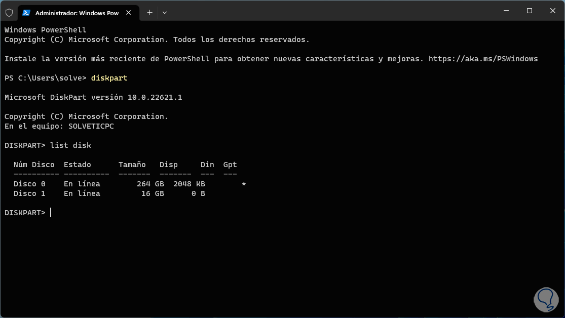 En la consola ejecuta el comando “diskpart” para acceder a la utilidad y luego listamos los discos con el comando “list disk”: