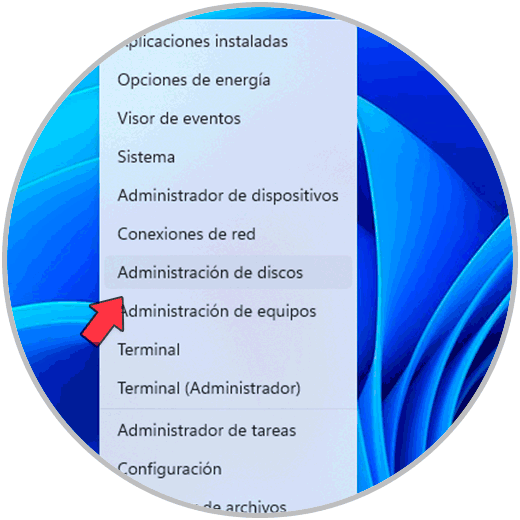 Aunque se ha aplicado formato al disco aun no es visible en el sistema, para esto vamos a dar clic derecho sobre el menú Inicio y luego damos clic en la opción “Administración de discos”: