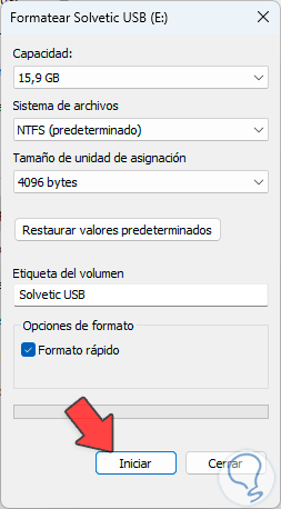 Podremos hacer los ajustes necesarios en cuanto a nombre y sistema de archivos y luego damos clic en “Iniciar”, será necesario confirmar el proceso: