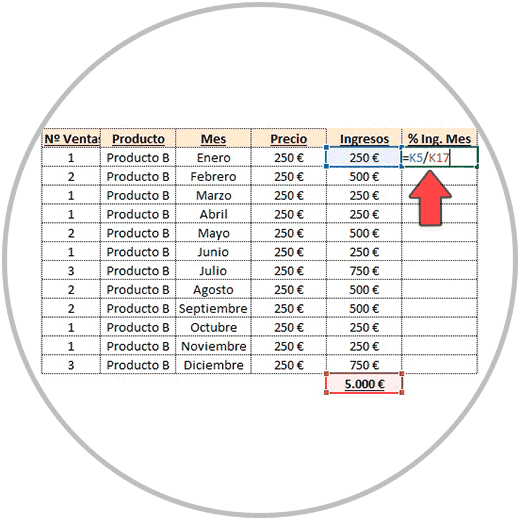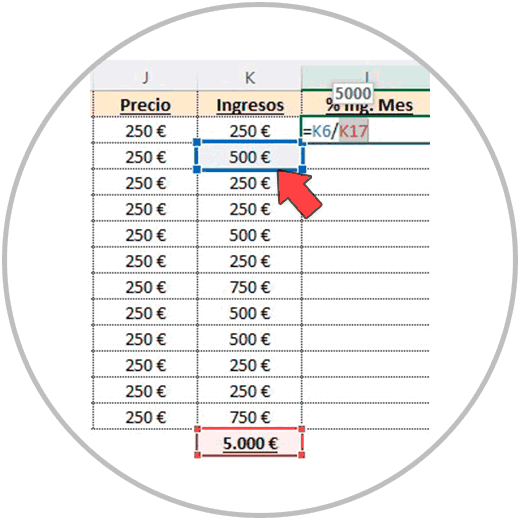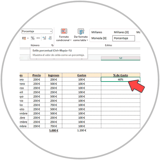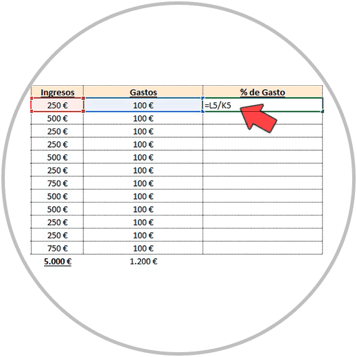 Así por ejemplo, si queremos calcular que porcentaje de gasto tenemos sobre un ingreso, siguiendo con el ejemplo, realizaríamos la operación oportuna en este caso que sería una división: Gasto/ Ingreso.