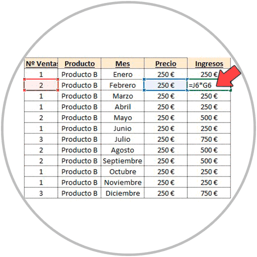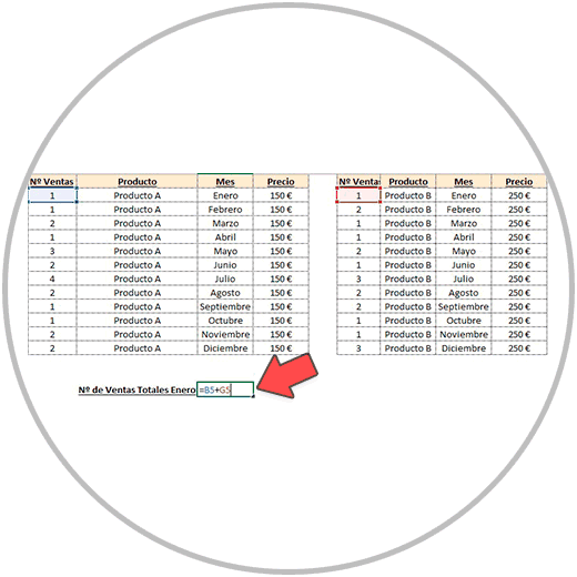 En el ejemplo, se suman dos celdas concretas para poder obtener un resultado específico, que es el N.º de ventas totales del mes de enero del Producto A y del Producto B.
