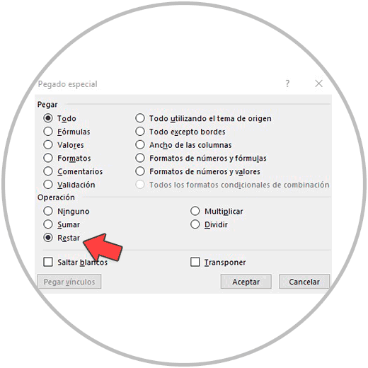 Ahora en la ventana de pegado especial, localizamos y marcamos “Restar”, como en la imagen y damos clic en “Aceptar”.