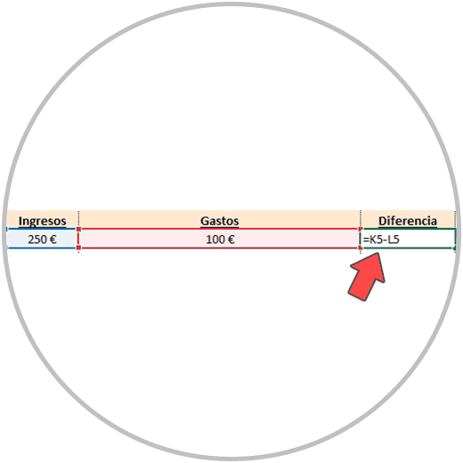 En el ejemplo, puedes ver cómo podemos realizar una resta en una celda, introduciendo como ya sabemos primero el signo "="; Después seleccionamos la celda o introducimos el número con el teclado que queremos usar como primer elemento en la fórmula (minuendo). Usamos acto seguido el operador o signo de resta "-" , e introducimos el valor de resta (sustraendo).