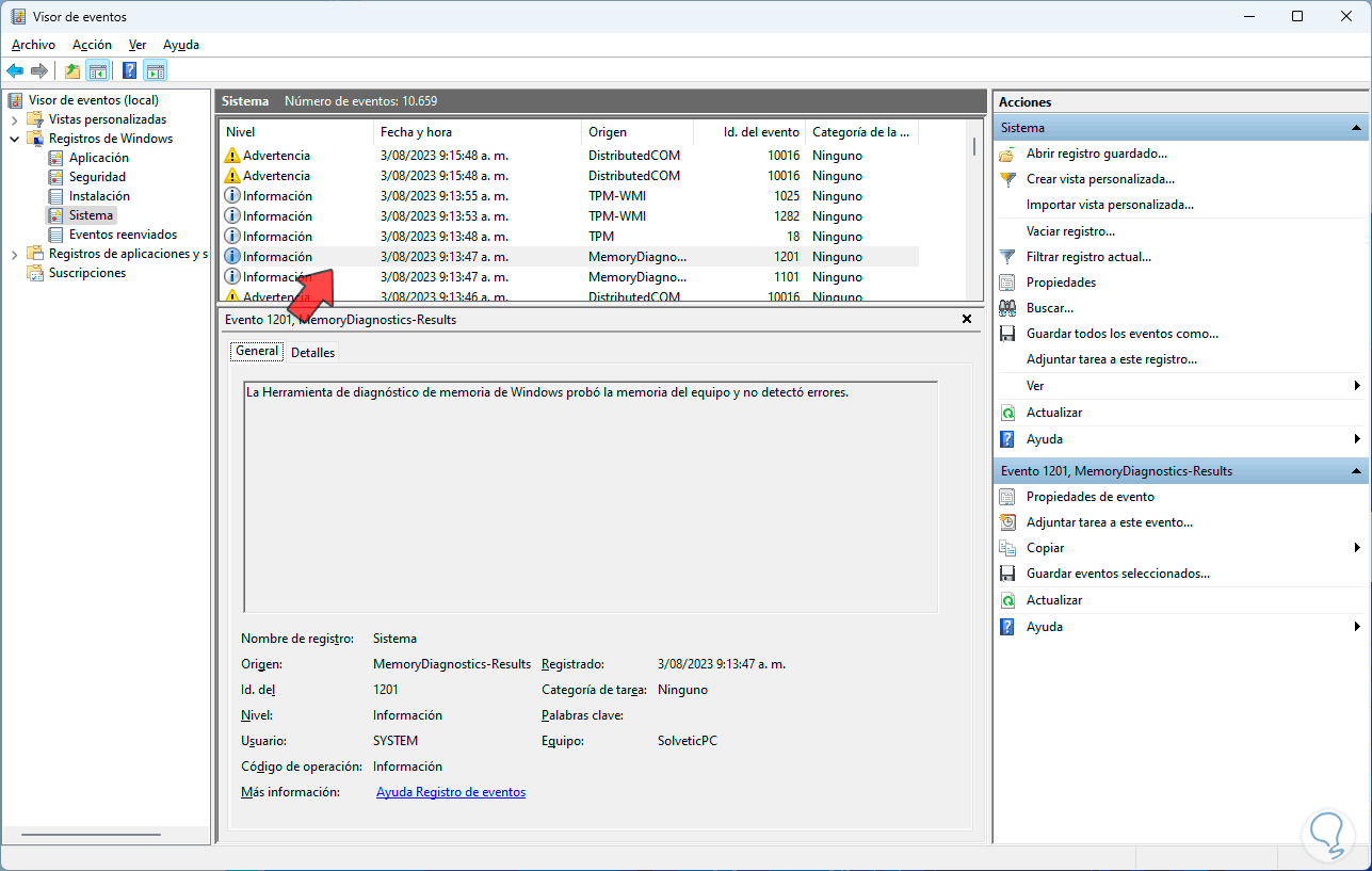 En caso de ver algún error, podemos abrir el Visor de eventos desde Inicio:
