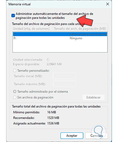 Vamos a confirmar que este activa la casilla “Administrar automáticamente el tamaño del archivo de paginación para todas las unidades”: