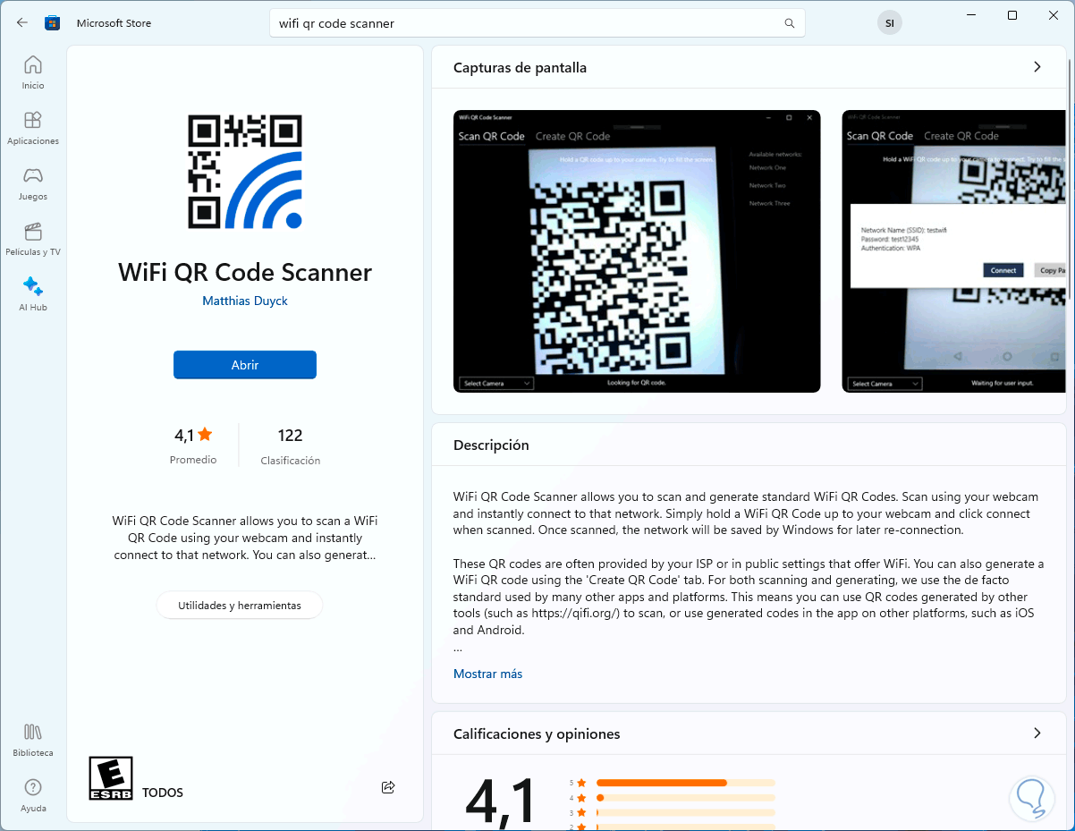 Para iniciar vamos a abrir la Tienda de Windows y allí buscamos la aplicación llamada “wifi qr code scanner”: