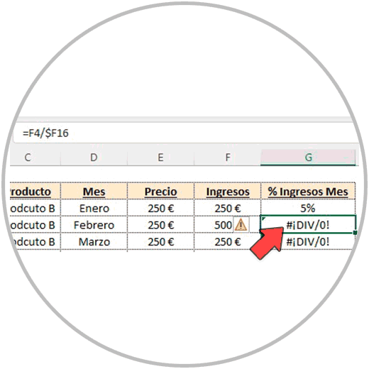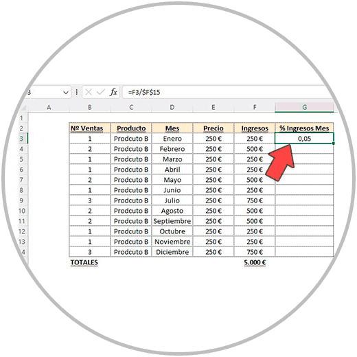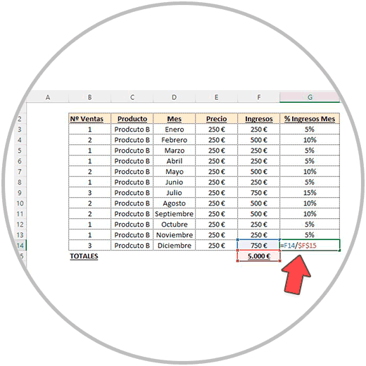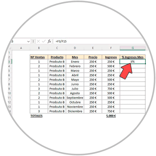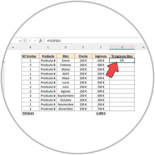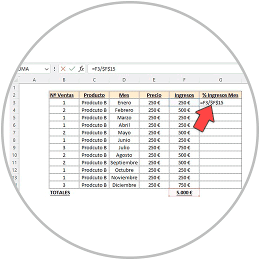 Si queremos ver qué porcentaje de los ingresos totales atribuimos a cada mes, tendremos que realizar una operación (en una columna nueva) que implica a los ingresos que se han generado cada mes, y a los ingresos totales generados en el año. La fórmula sería la siguiente: