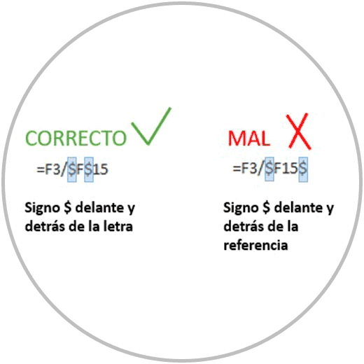 El motivo cuando queremos fijar una fórmula en Excel y recibimos a cambio un error, se debe principalmente a la mala colocación del signo $ en la fórmula. Es muy habitual colocar el signo del Dólar delante y detrás de la celdas. Sin embargo, como hemos explicado anteriormente, El signo de Dólar debe colocarse delante y detrás de la letra de la referencia de celda, tal y como puedes ver en la imagen.