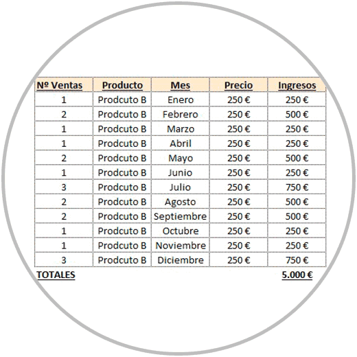 Así, tal y como veíamos en cómo copiar y pegar fórmulas en Excel, en una tabla donde tenemos información que complementa las ventas que se registran en un periodo de tiempo determinado, una de las acciones que podremos llevar a cabo será el calcular a nivel de fila, los ingresos que hemos tenido en cada periodo. (En el ejemplo cada fila representa las ventas de un mes).