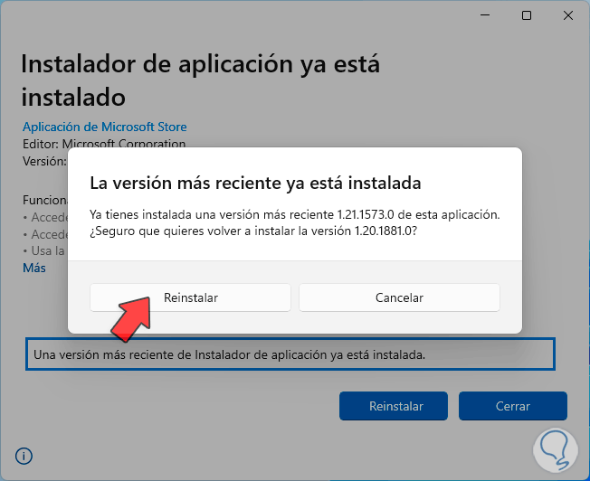 Damos clic en “Reinstalar” y veremos el siguiente mensaje: