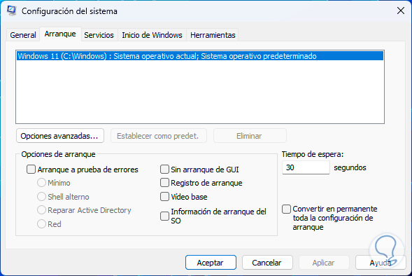 Ahora abrimos de nuevo Configuración del sistema y veremos que en la pestaña “Arranque” ya no está activa la casilla “Arranque a prueba de errores”: