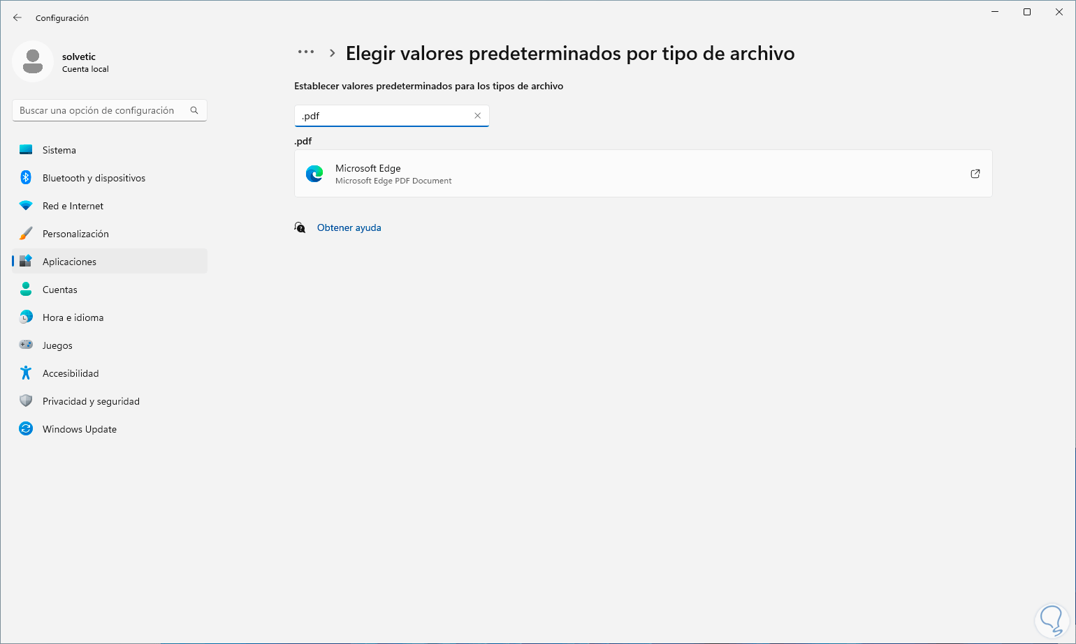 En las nuevas versiones de Windows 11 ya no se abre esta opción del Panel de control sino que se redireccionara a Configuración, allí vamos al cuadro de búsqueda en la parte superior e ingresamos la palabra “.pdf”, damos clic sobre la extensión para ver la aplicación actual de lectura: