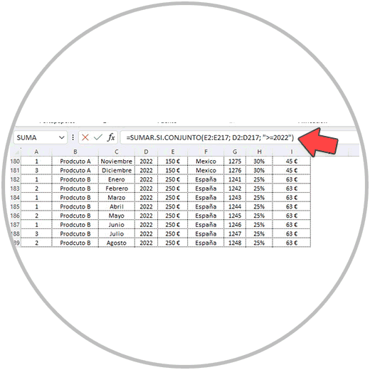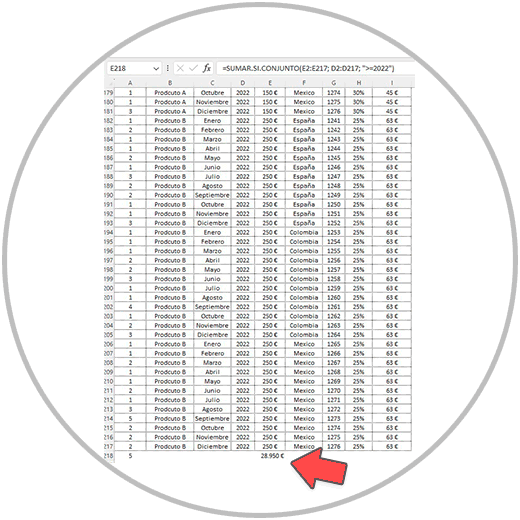 “calcular una suma condicional en Excel configurado en español, en un archivo donde tengo una tabla con varias columnas hasta la fila 217 con encabezados en la primera fila. Quiero sumar las ventas de la columna "E" solo si en la columna "D" el valor que aparece es igual o mayor que 2022”