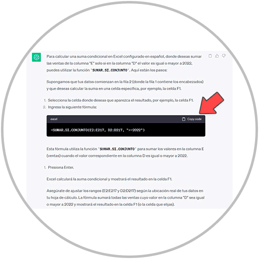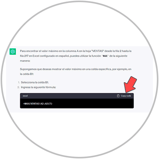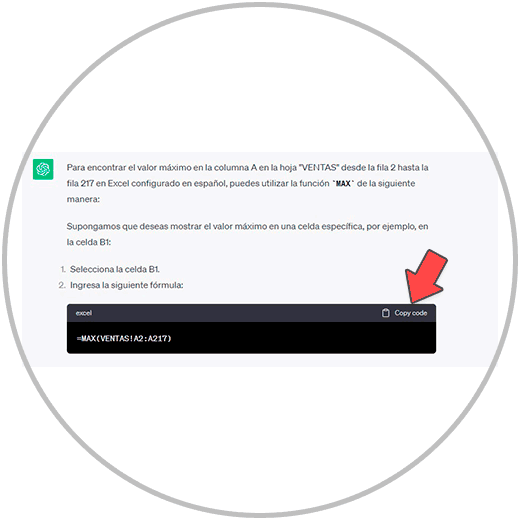 Copiamos la fórmula con el botón habilitado “Copy code”, en el frame o ventana donde vemos la fórmula en ChatGPT, después de hacer nuestra consulta.