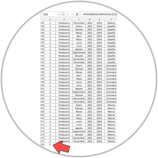 • Debemos indicar, en caso de ser necesario, desde qué fila a qué fila queremos realizar la operación. Si por ejemplo queremos calcular un promedio, como vamos a hacer debajo de ejemplo, de una columna que llega hasta la fila 217, debemos incluirlo también en la petición que vamos a realizar.