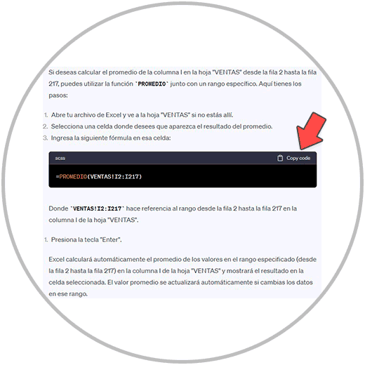 Al escribir y pulsar en enviar mensaje, ChatGPT nos devolverá una respuesta en la cual nos dará el nombre de la función que debemos utilizar (Promedio) y la explicación, junto con los pasos que debemos seguir para calcular el valor promedio en Excel; Y lo que más nos interesa, nos arrojará en un frame la sintaxis, que podremos copiar directamente desde el botón “Copy code”.