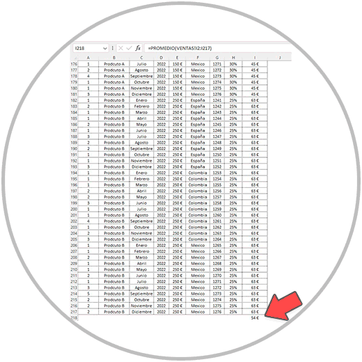 “calcular valor promedio en Excel configurado en español de la columna I que se encuentra en la hoja "VENTAS" desde la fila 2 hasta la fila 217”.