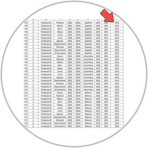 Ahora pegamos la fórmula en nuestro Excel, justo debajo de los datos en la Columna I