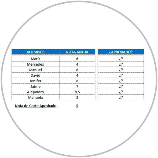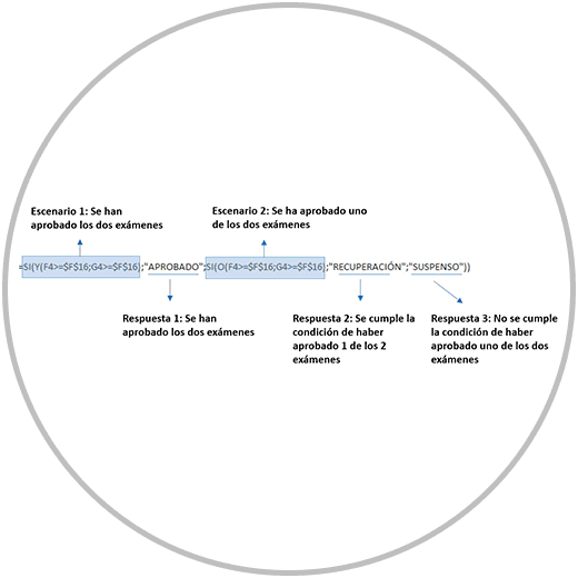 En el caso de no haber aprobado, en la fórmula se recoge el “No” como respuesta, en caso de que un alumno haya suspendido uno de los dos exámenes, o haya suspendido los dos. Es decir que tenemos dos escenarios posibles